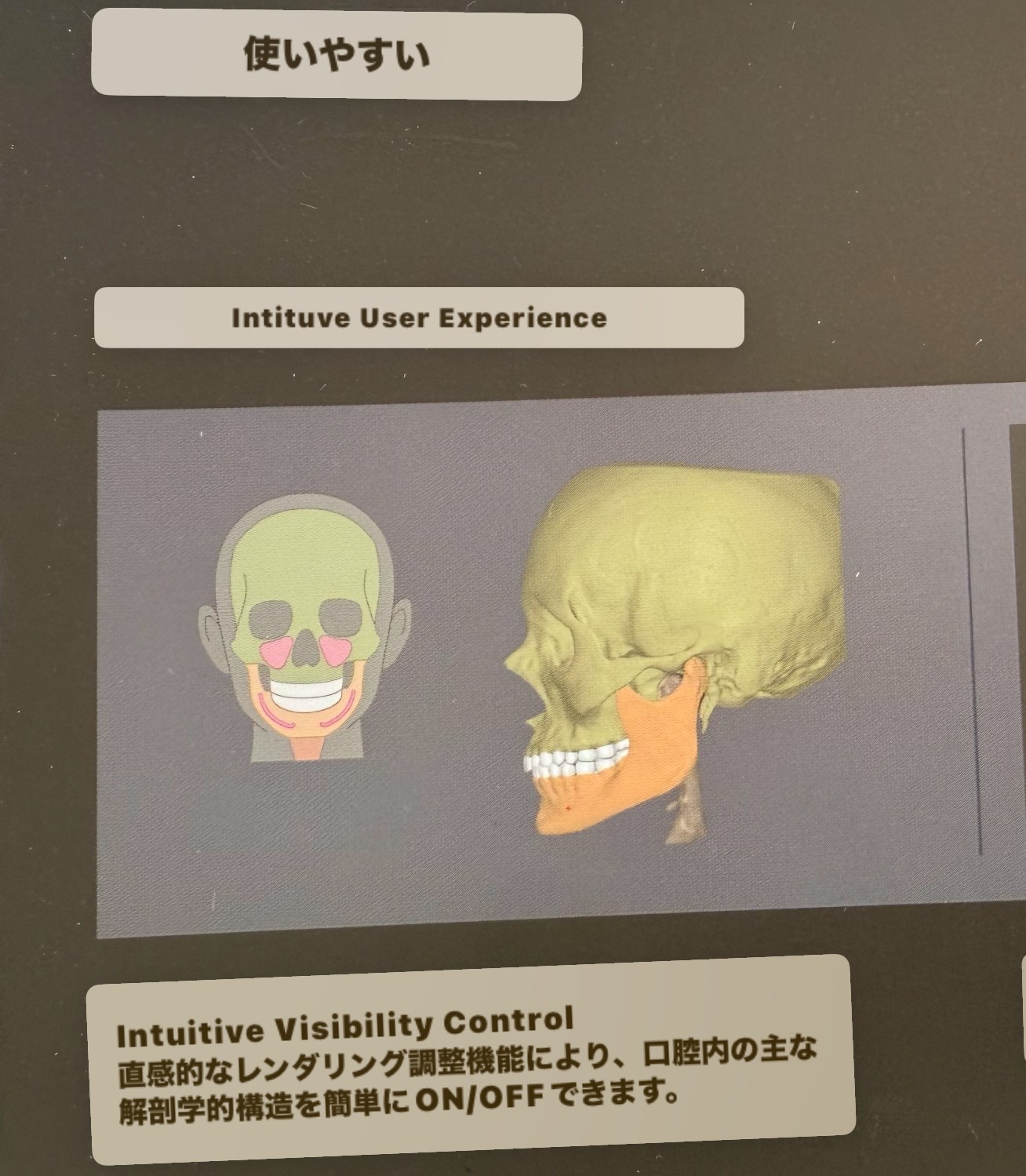「Intuitive Visibility Control」では、口腔内の主要な解剖学的構造を簡単にON/OFFできる機能が搭載されており、顎骨、歯列、軟組織などを必要に応じて選択的に色分けで表示できます。これにより、従来のCT画像やパノラマ像だけでは得られなかった立体的な画像が見られた、色分けされることで更に分かりやすい画像へと変化します。インプラント埋入位置の把握や矯正治療における骨格分析において有効手段となるでしょう。